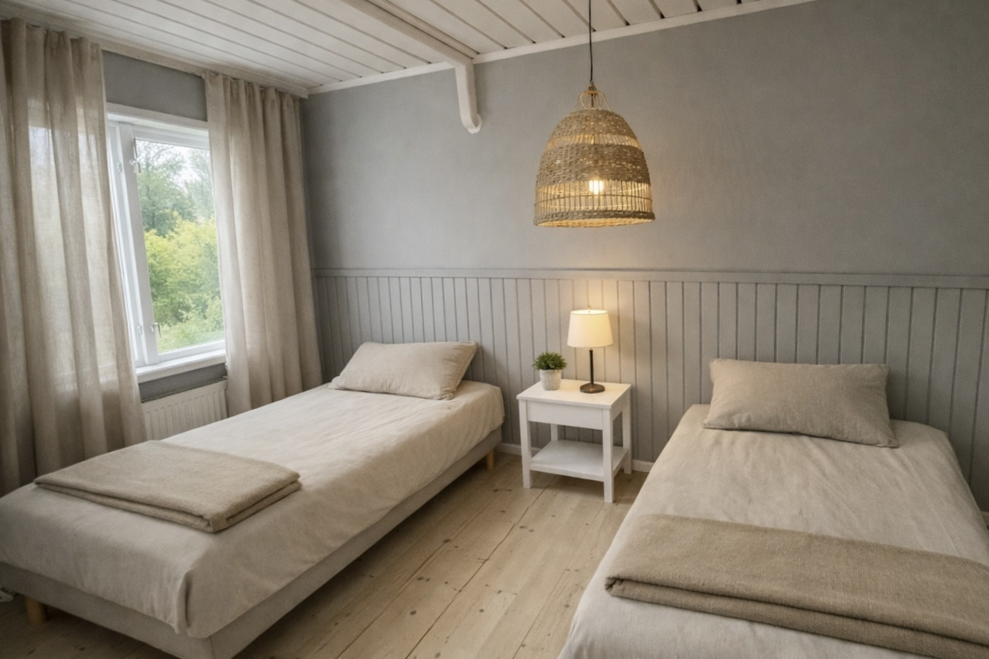 Das Haus bietet moderne und gemütliche Unterkünfte mit einem behaglichen Kamin, der das ganze Jahr über für eine warme und einladende Atmosphäre sorgt. Es gibt zwei Schlafzimmer – eines mit einem Doppelbett und eines mit zwei Einzelbetten. Zusätzlich gibt es einen separaten Schlafbereich mit Vorhang und einem Schlafsofa für einen Erwachsenen und ein Kind.