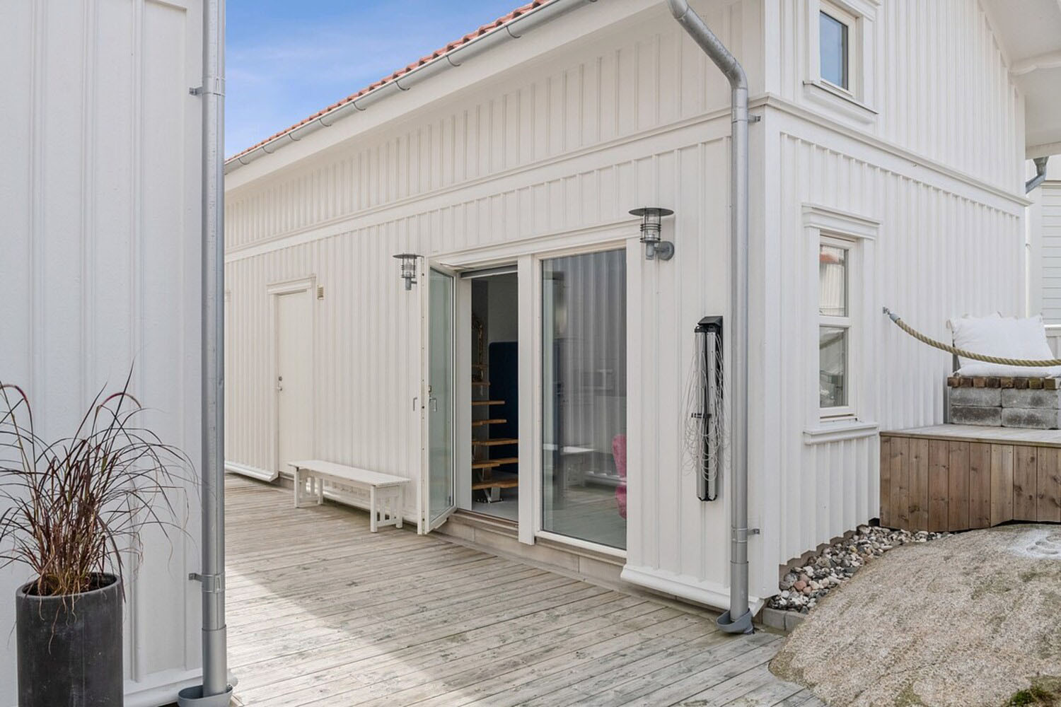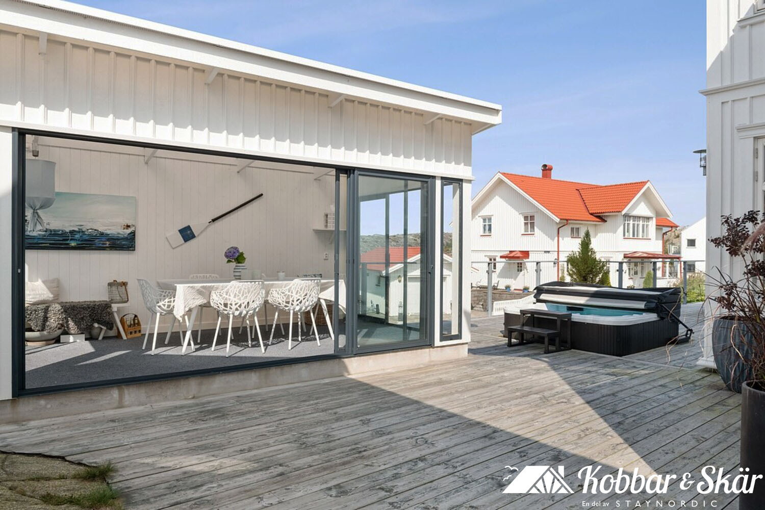 Willkommen in einem geräumigen und stilvollen Haus im beliebten Rönnäng auf Tjörn, mit Platz für bis zu 15 Personen, verteilt auf 6 Schlafzimmer. Hier wohnen Sie komfortabel in einem hellen und modernen Haus mit großzügigen Flächen, ideal für große Familien oder Gruppen, die gemeinsam Urlaub machen möchten. Nur 550 Meter vom Hafen entfernt wohnen Sie in unmittelbarer Nähe zu Badeplätzen und dem Leben in der Schärenlandschaft. Das Haus verfügt über einen offenen und geselligen Grundriss mit einer großen, voll ausgestatteten Küche, die zum natürlichen Treffpunkt wird. Es gibt viel Platz für gemeinsame Mahlzeiten und geselliges Beisammensein. Mehrere Wohnzimmer bieten Möglichkeiten, sowohl Zeit miteinander zu verbringen als auch sich zurückzuziehen. Die hellen Schlafzimmer sind geschmackvoll eingerichtet und bieten guten Komfort. Insgesamt gibt es 3 Badezimmer mit Dusche, eines davon verfügt zusätzlich über eine Badewanne. Im Außenbereich stehen mehrere Bereiche zur Verfügung, und nach einem Tag am Meer können Sie auf der schönen gepflasterten Terrasse des Hauses entspannen. Die Lage ist sehr gut, mit fußläufiger Entfernung zu salzigen Badeplätzen an den Klippen sowie in der Nähe von Restaurants und einem Supermarkt.
