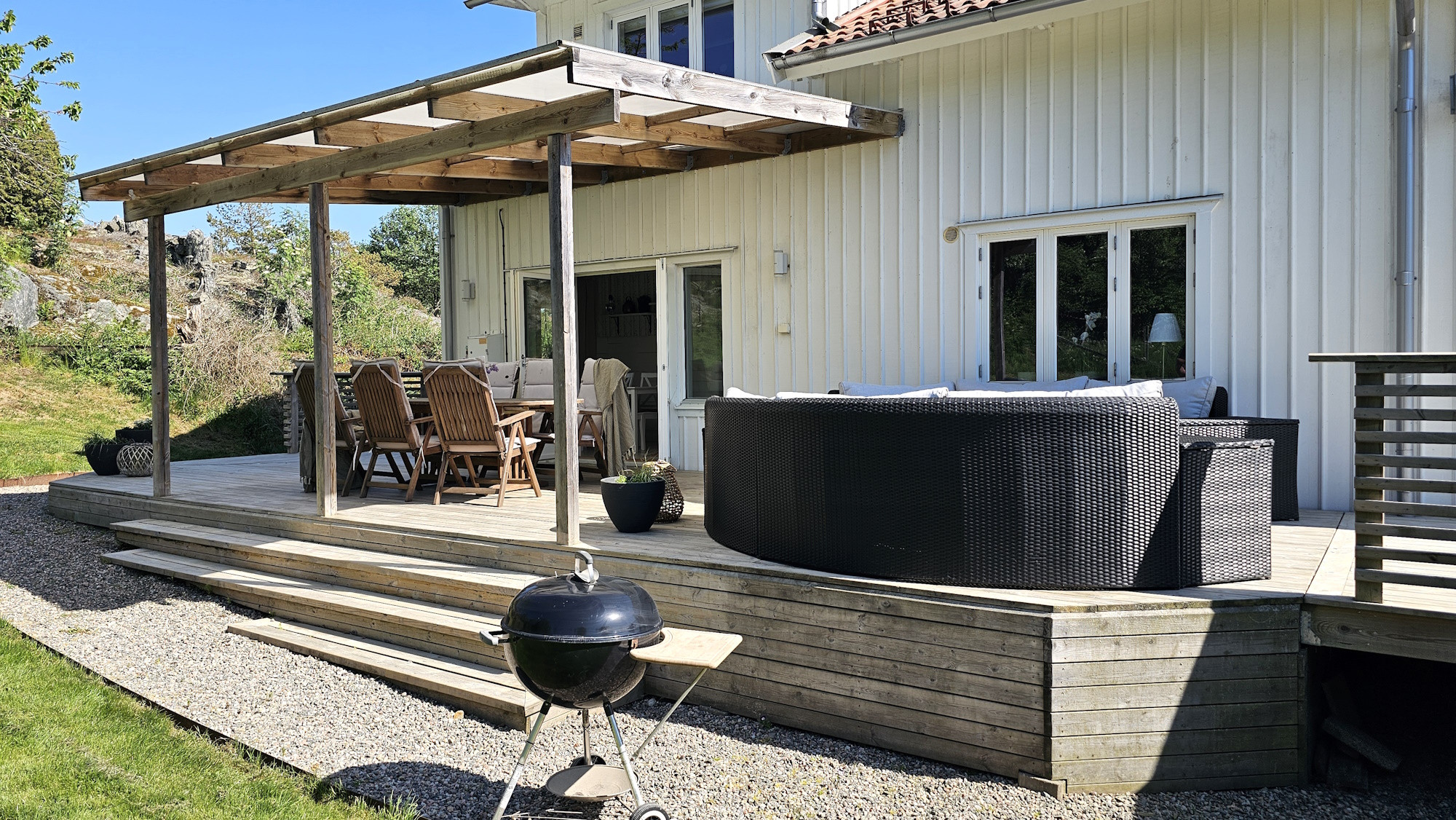 Die einladende Terrasse auf der Rückseite eignet sich perfekt für Sommerabende mit Grill und geselligem Beisammensein. Auf dem Grundstück befindet sich außerdem eine gemütliche Grillhütte/Feuerstelle, die vom Eigentümer gemietet werden kann. Das Meer und eine schöne Naturbadestelle liegen nur zwei Kilometer entfernt.