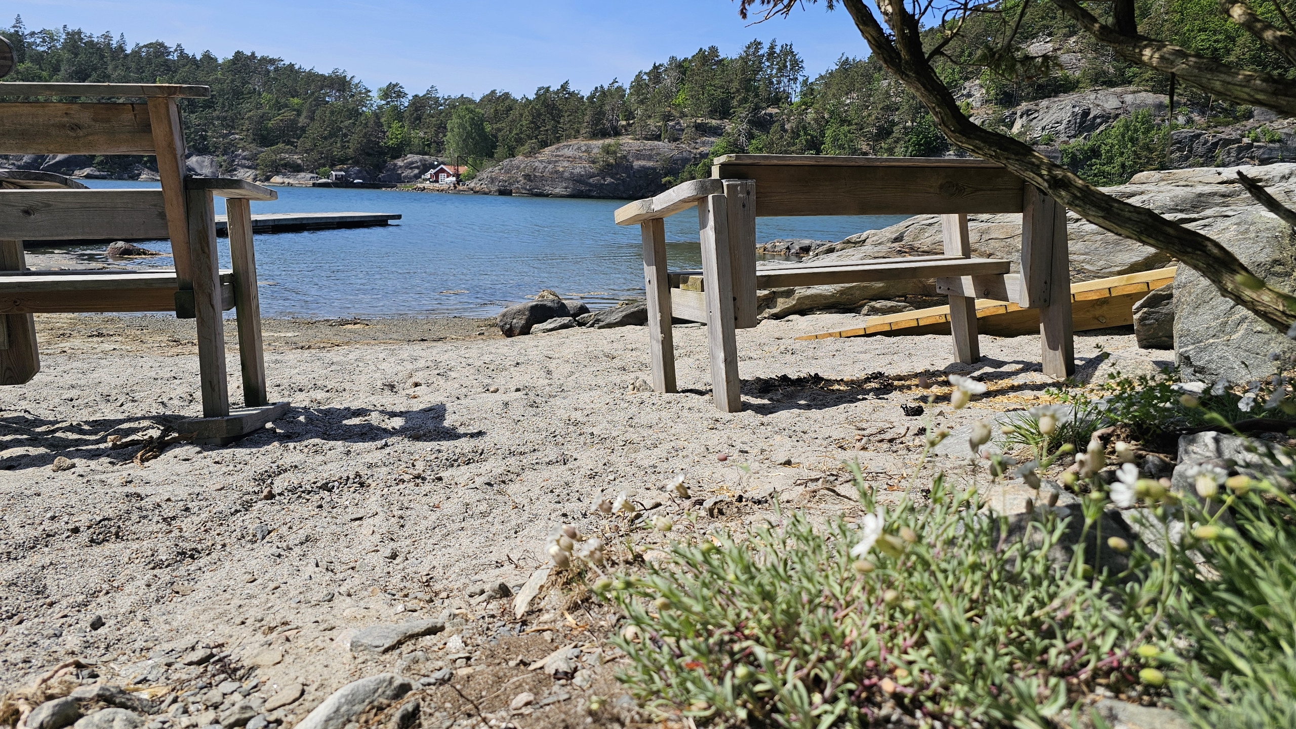 Im Außenbereich finden Sie mehrere Terrassen in verschiedenen Himmelsrichtungen, eine große Terrasse rund um Teile des Haupthauses sowie eine weitere Terrasse am Gästehaus. Eine kleine Treppe führt hinauf zu einem Aussichtspunkt auf dem Felsen, wo Sie den Blick auf Wald und Meer sowie die Abendsonne genießen können. Das Grundstück ist abwechslungsreich mit Felsen und Rasenflächen und eignet sich sowohl zum Spielen als auch zum Entspannen. Es gibt außerdem ein kleines Spielhaus und eine Garage mit Tischtennisplatte.