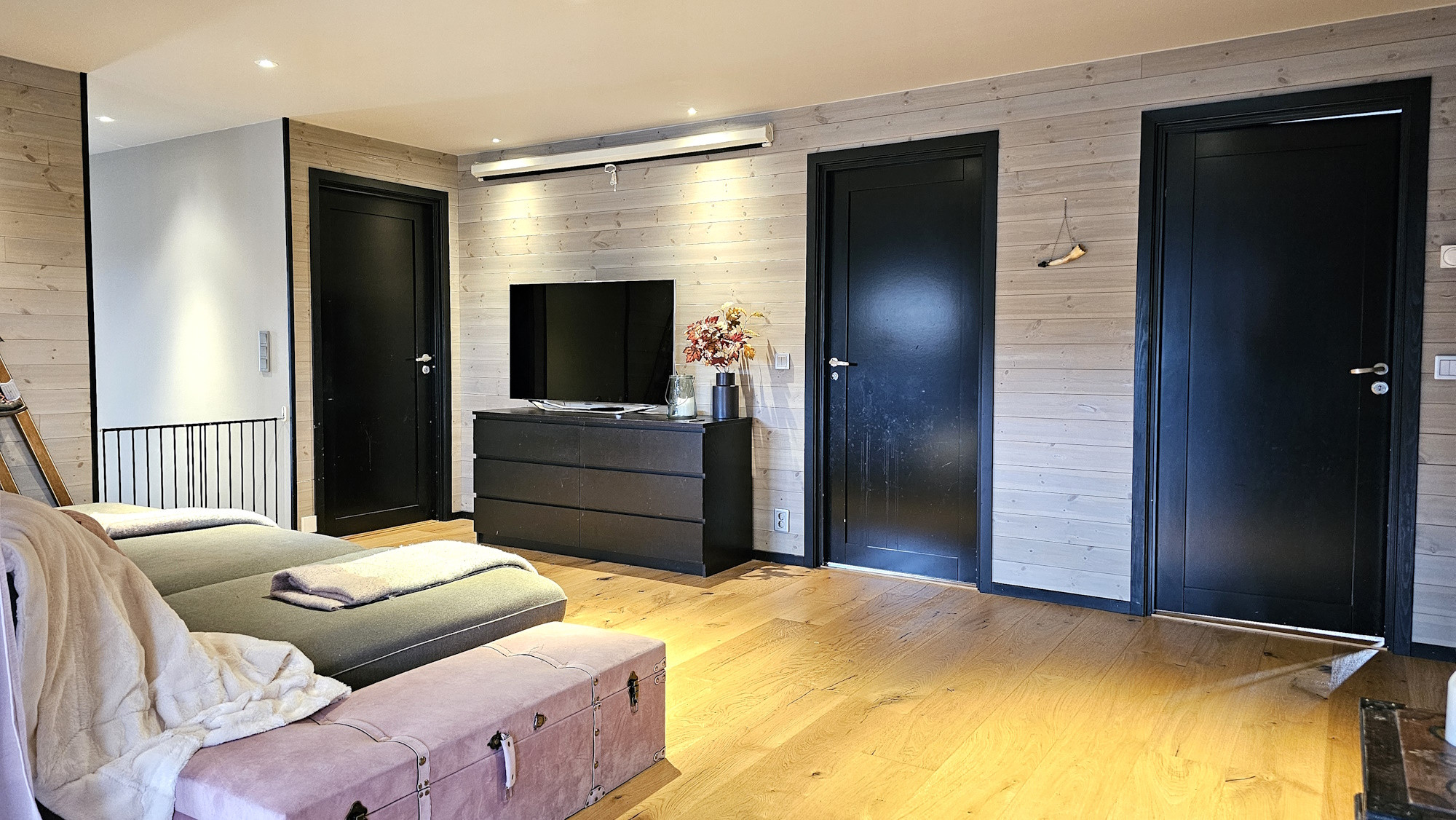 Für Kinder gibt es ein Trampolin und Schaukeln, und für Erwachsene ein voll ausgestattetes Fitnessstudio mit Laufband, Crosstrainer, freien Gewichten und Apple TV. Das Haus ist außerdem haustierfreundlich und verfügt über einen kleinen Hundezwinger direkt am Grundstück. Ein Ort, an dem Komfort, Natur und Luxus in perfekter Harmonie aufeinandertreffen.