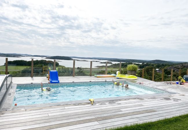 Willkommen in einer Villa, die eine der schönsten Aussichten auf Orust bietet. Sie wohnen hier in einem modernen und großzügigen Haus mit drei Etagen, beheiztem Pool, mehreren Terrassen, Fitnessraum und Spielplatz. Perfekt geeignet für zwei bis drei Familien, die im Urlaub das gewisse Extra suchen. Das Haus bietet 10 reguläre Schlafplätze sowie ein zusätzliches Bett, verteilt auf drei Schlafzimmer, einen großen Aufenthaltsraum und mehrere Gemeinschaftsbereiche.