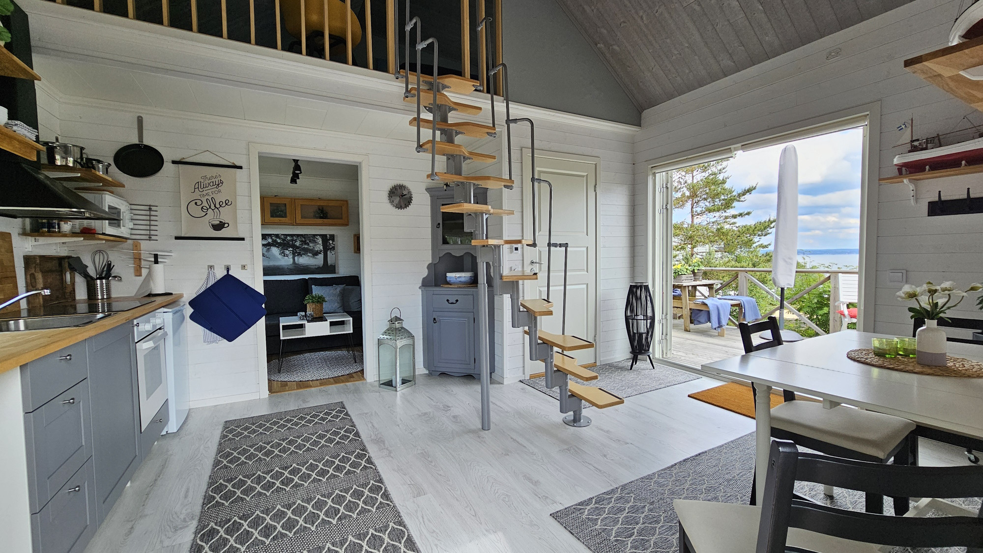 The accommodation sleeps up to 4 guests (+ 1 small child). On the loft there is a comfortable double bed (180 cm) and in the living room a sofa bed (180 cm). A travel cot and highchair are also available for small children. The kitchen is fully equipped with stove, oven, fridge with freezer compartment, microwave and coffee maker. The bathroom is modern with WC, sink and shower. On the terrace you can enjoy barbecues and a beautiful view – sun loungers are available both at the front and the back.