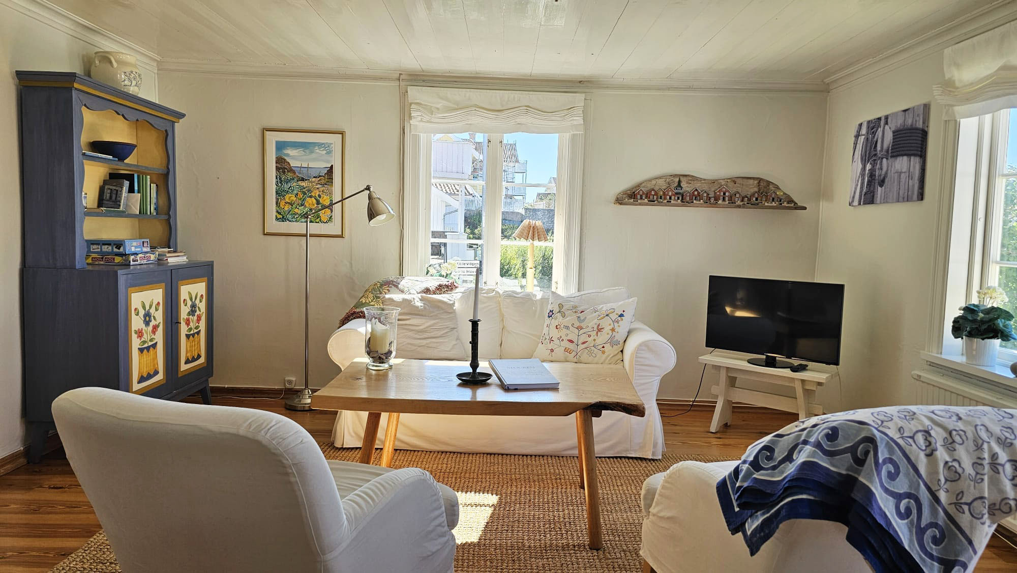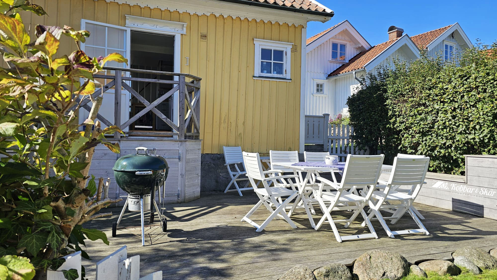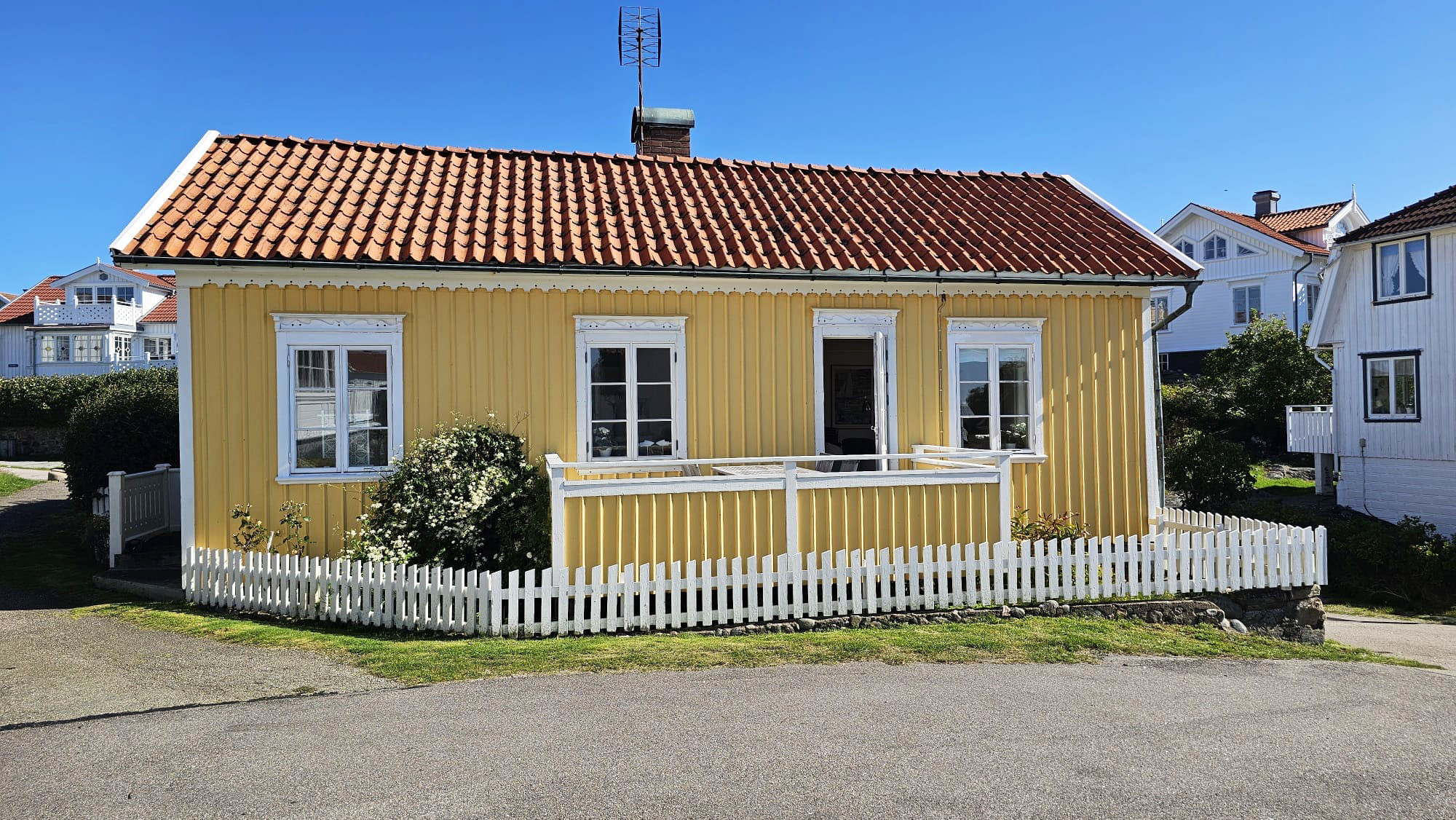 Welcome to this genuine and cozy holiday home in Ellös, located in a classic West Coast village with the sea just around the corner. The house offers a bright and welcoming atmosphere with charming details, perfect for families or friends who want to experience the Bohuslän archipelago up close. The accommodation offers space for up to 8 guests and includes a total of 2 bedrooms as well as additional sleeping places in a guest cottage and the living area. There is a fully equipped kitchen, one bathroom with shower and toilet, and an inviting living room where you can gather after a day of excursions. From the house you reach the spacious terrace with garden furniture and a barbecue, an ideal spot for long summer evenings. The fenced garden makes the property especially child friendly and is also suitable for guests traveling with a dog. Electricity is included in the rent and the house is heated by electric heating and a heat pump. A fireplace is available for cooler evenings.