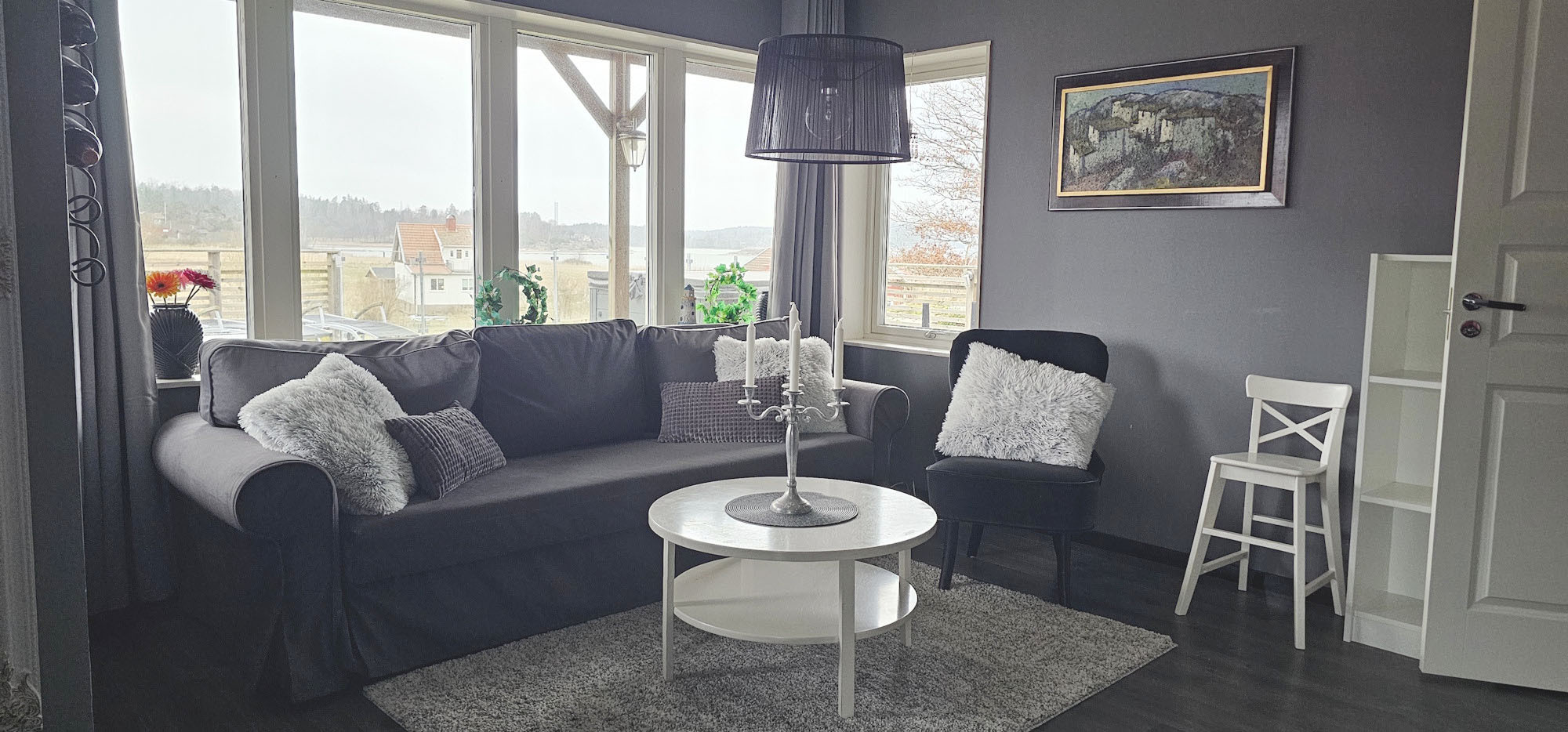 This treasure is located on the first floor with a panoramic view of the Hakefjord on the eastern side of Tjörn, Sweden's fourth largest island. From the parking lot at Låka bathing place, you turn down a small hill and find yourself in the cozy garden with its plum and cherry trees. Thanks to the hedge, fence and hill, the garden is protected from view.