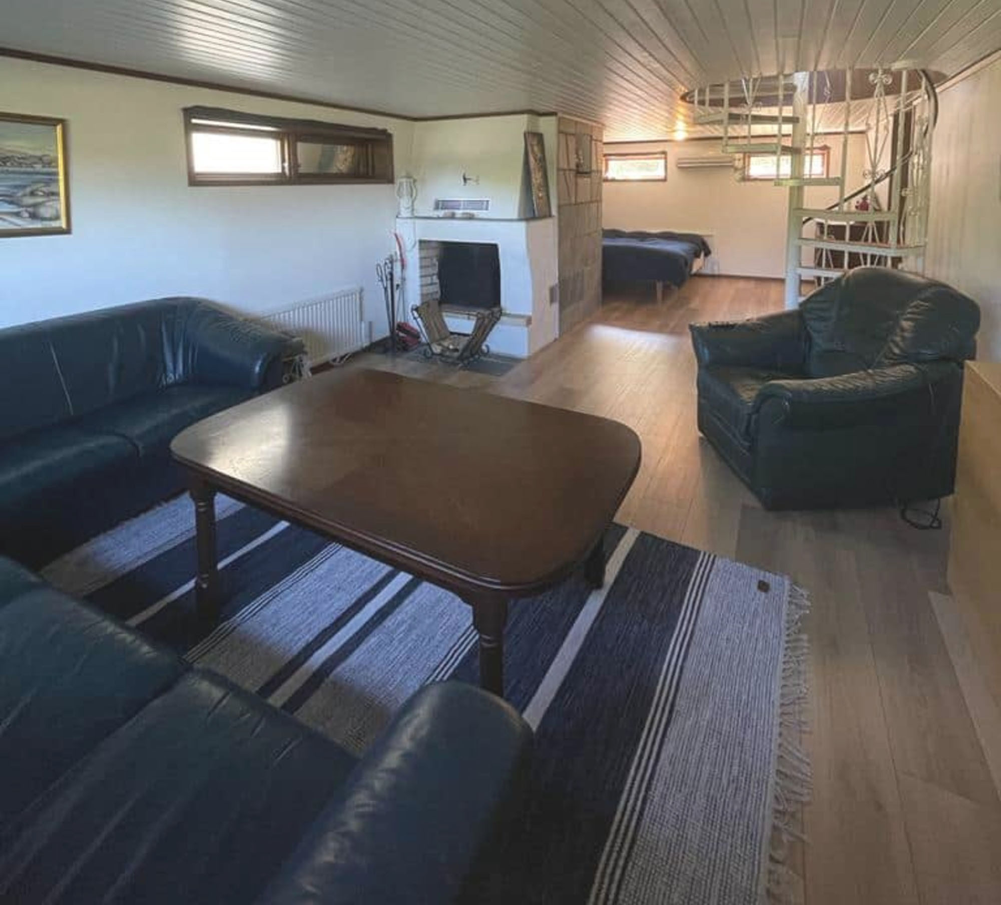 The house accommodates up to six people and offers three bedrooms: one with a double bed, one with bunk beds and one with a single bed. There is also a bathroom with shower and toilet, a well equipped kitchen with dishwasher, and two living rooms with sofas, TV and fireplaces. The cozy kitchen stove and the two fireplaces create a warm atmosphere all year round. Downstairs you will find an additional living room and a laundry area.