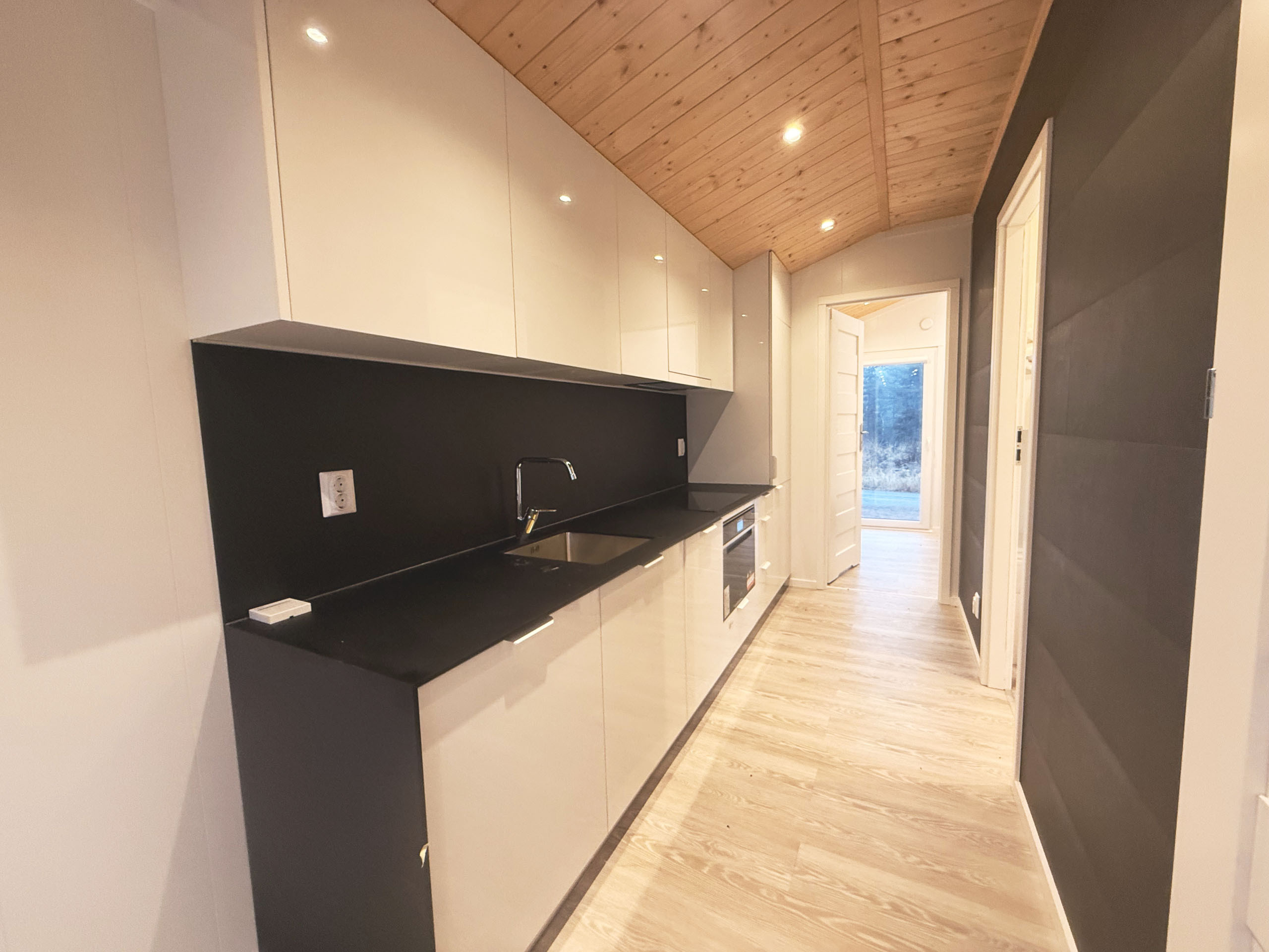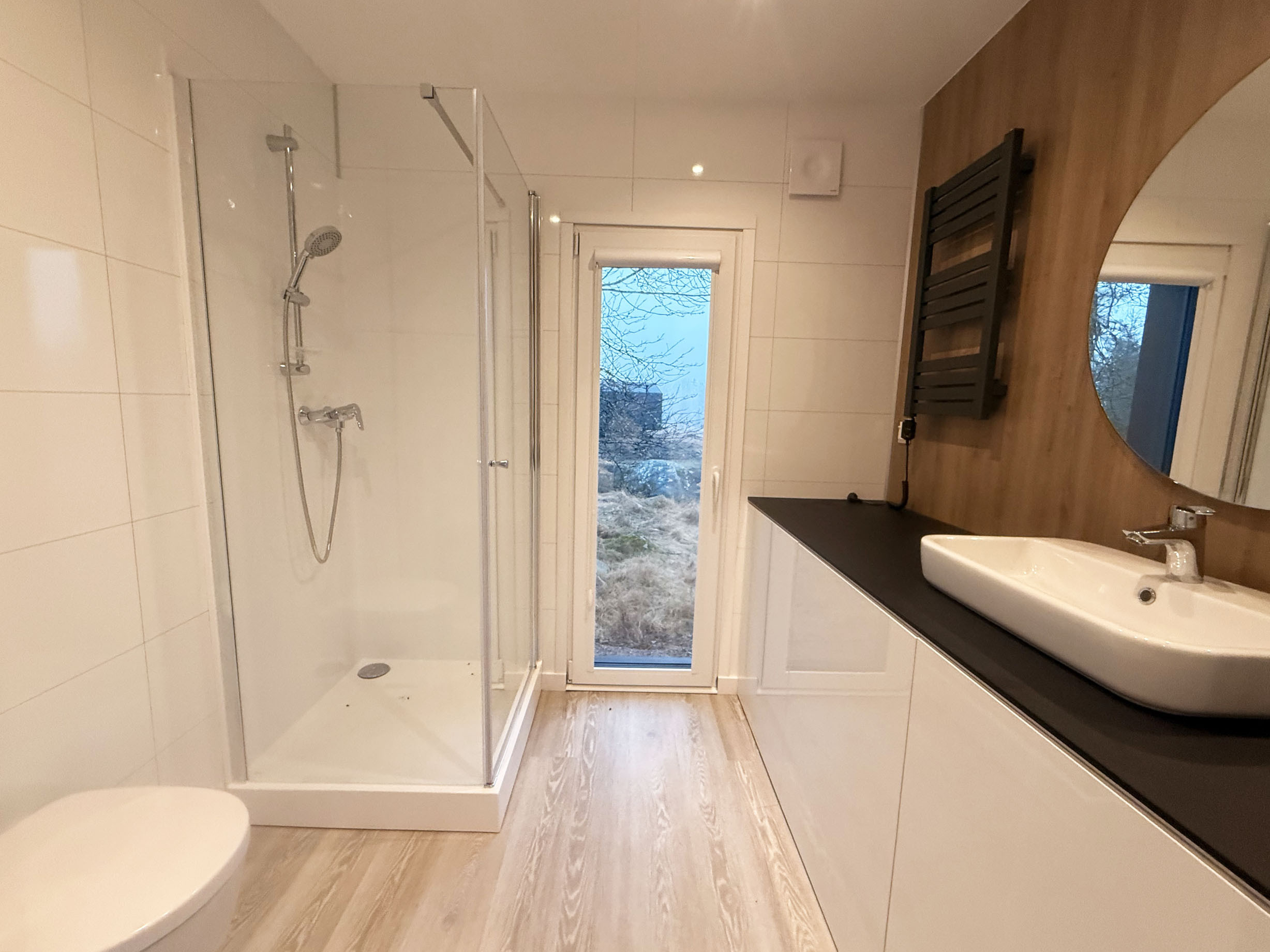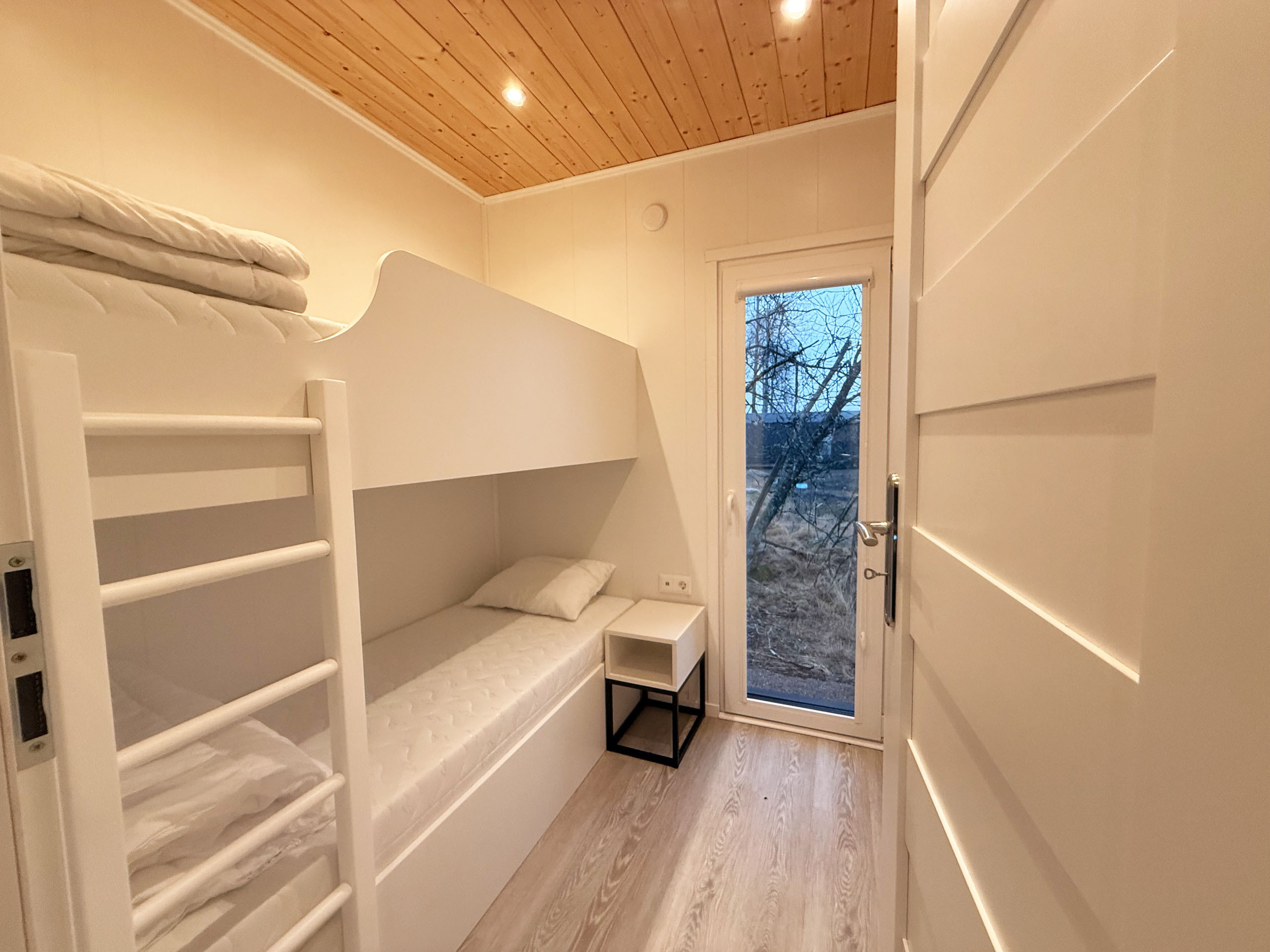 Welcome to a brand new holiday home, perfect for a relaxing stay for up to 4 people. The accommodation has two bedrooms, one with a double bed and one with a bunk bed, as well as a sofa bed in the living room. There is a fresh bathroom with shower and a fully equipped kitchen with a dining table for 4 people. The house is located directly adjacent to the forest and has a fantastic view of both forest and meadow. Smaller terrace for lovely summer evenings. Outside there is also a paved patio with barbecue and garden furniture, perfect for relaxing in nature