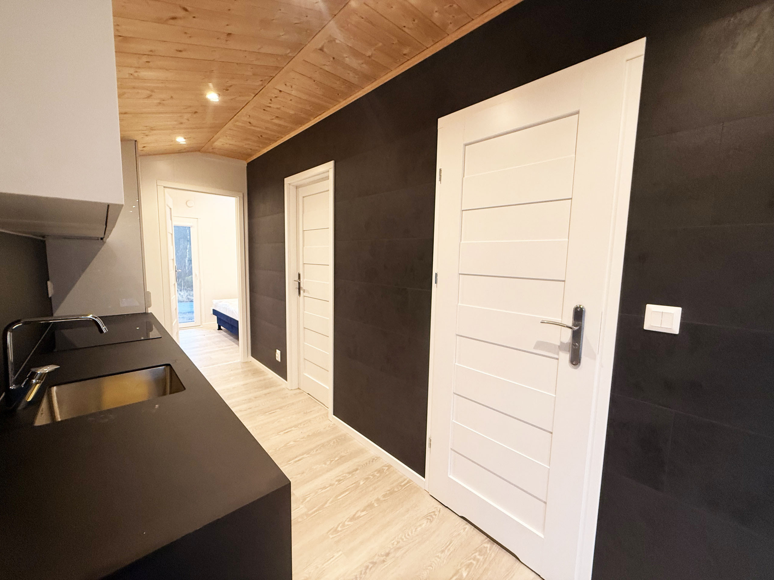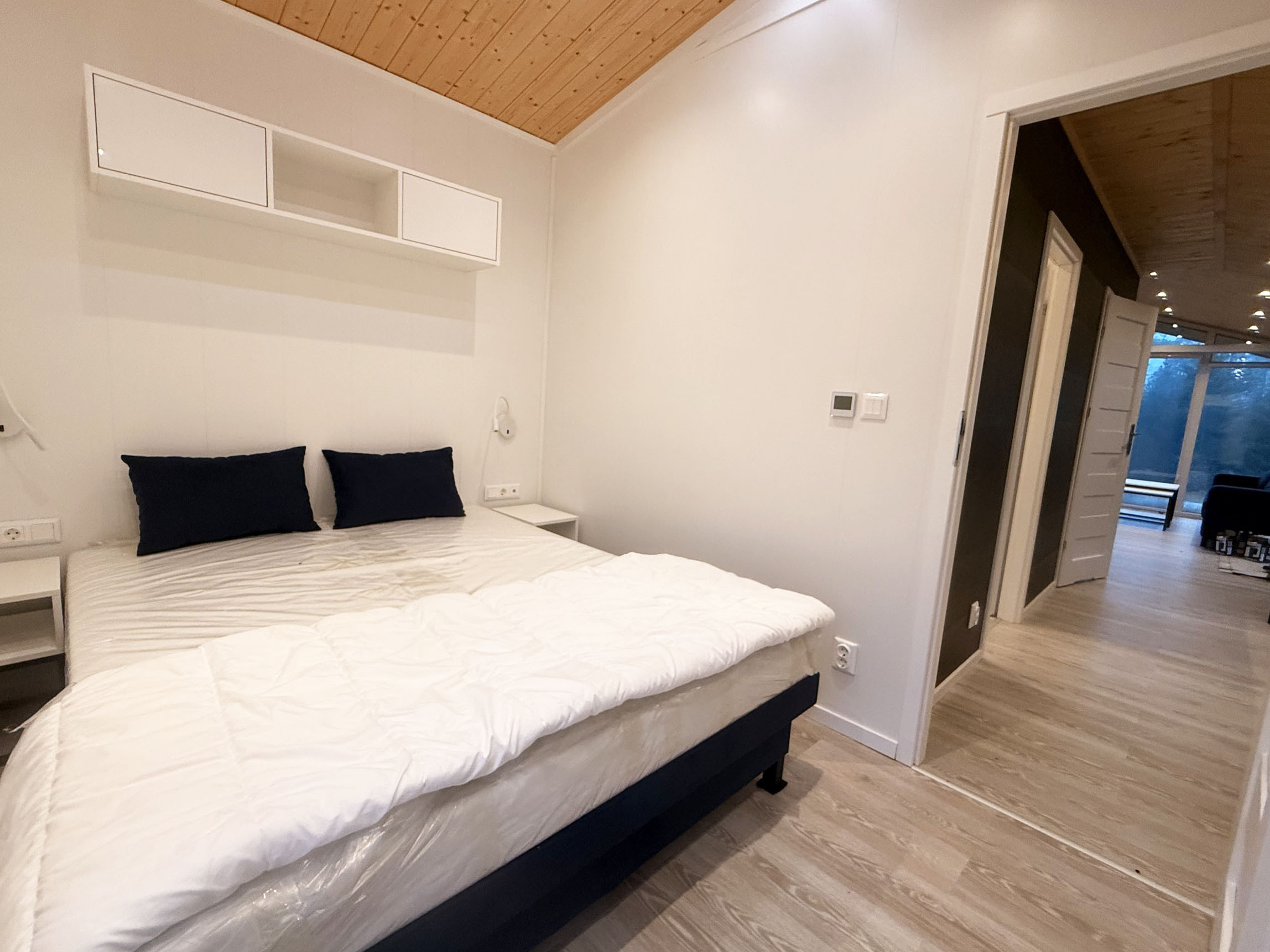 Welcome to a brand new holiday home, perfect for a relaxing stay for up to 4 people. The accommodation has two bedrooms, one with a double bed and one with a single bed, as well as a sofa bed in the living room. There is a fresh bathroom with shower and a fully equipped kitchen with a dining table for 4 people. The house is located directly next to the forest and has a fantastic view of both the forest and meadow. Small terrace for lovely summer evenings. Outside there is also a paved patio with barbecue and garden furniture, perfect for relaxing in nature