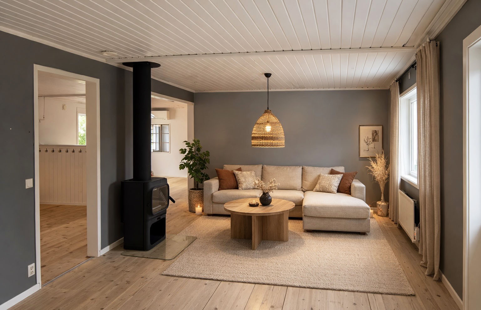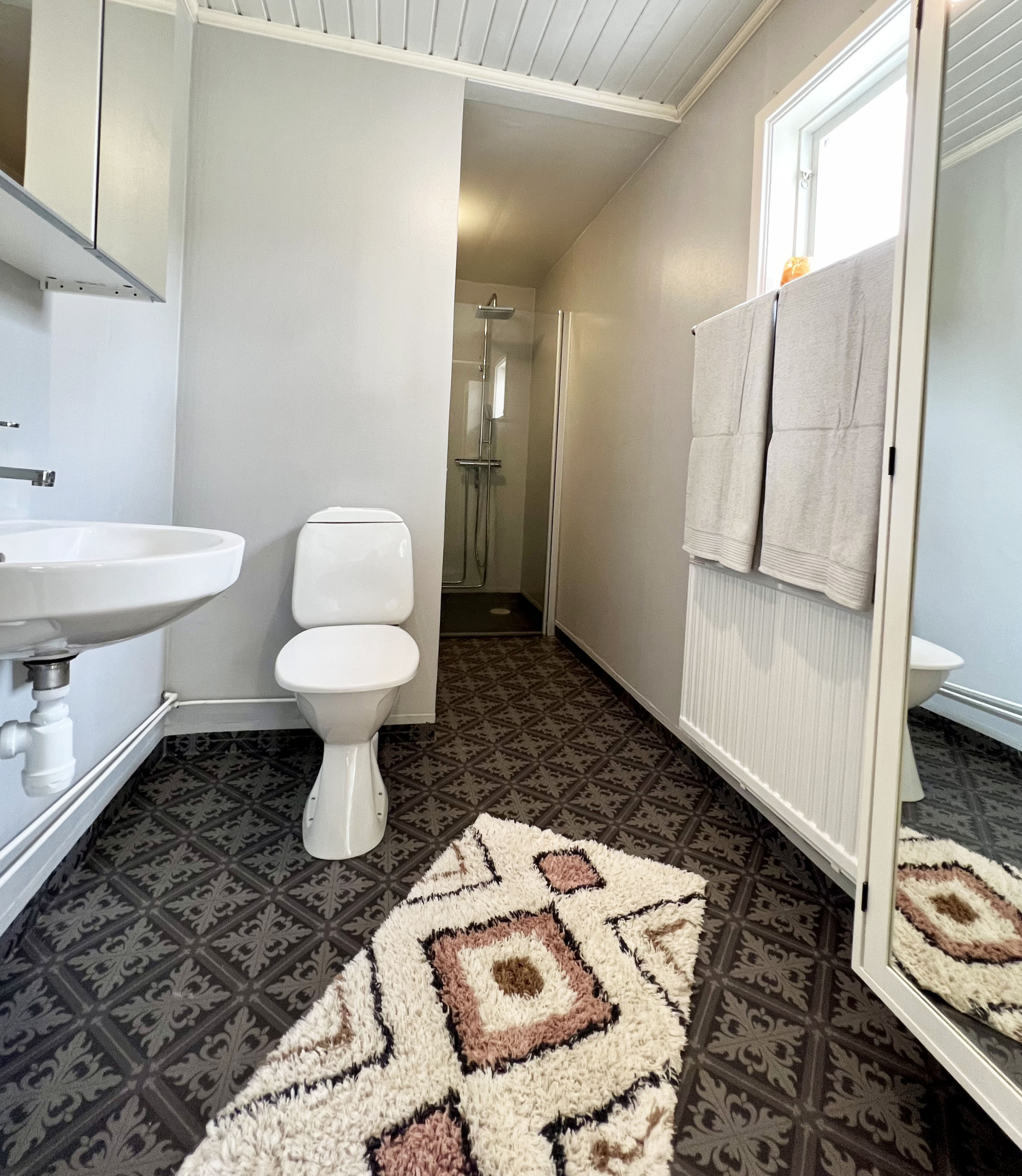 The house offers modern and homely accommodation with a cozy fireplace that creates a warm and inviting atmosphere all year round. There are two bedrooms - one with a double bed and one with two single beds. In addition, there is a separate sleeping area with a curtain and a sofa bed suitable for an adult and a child.