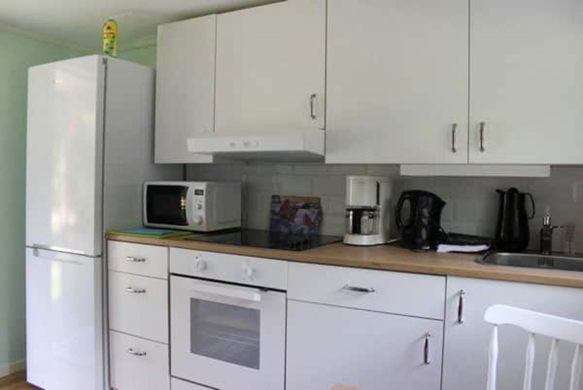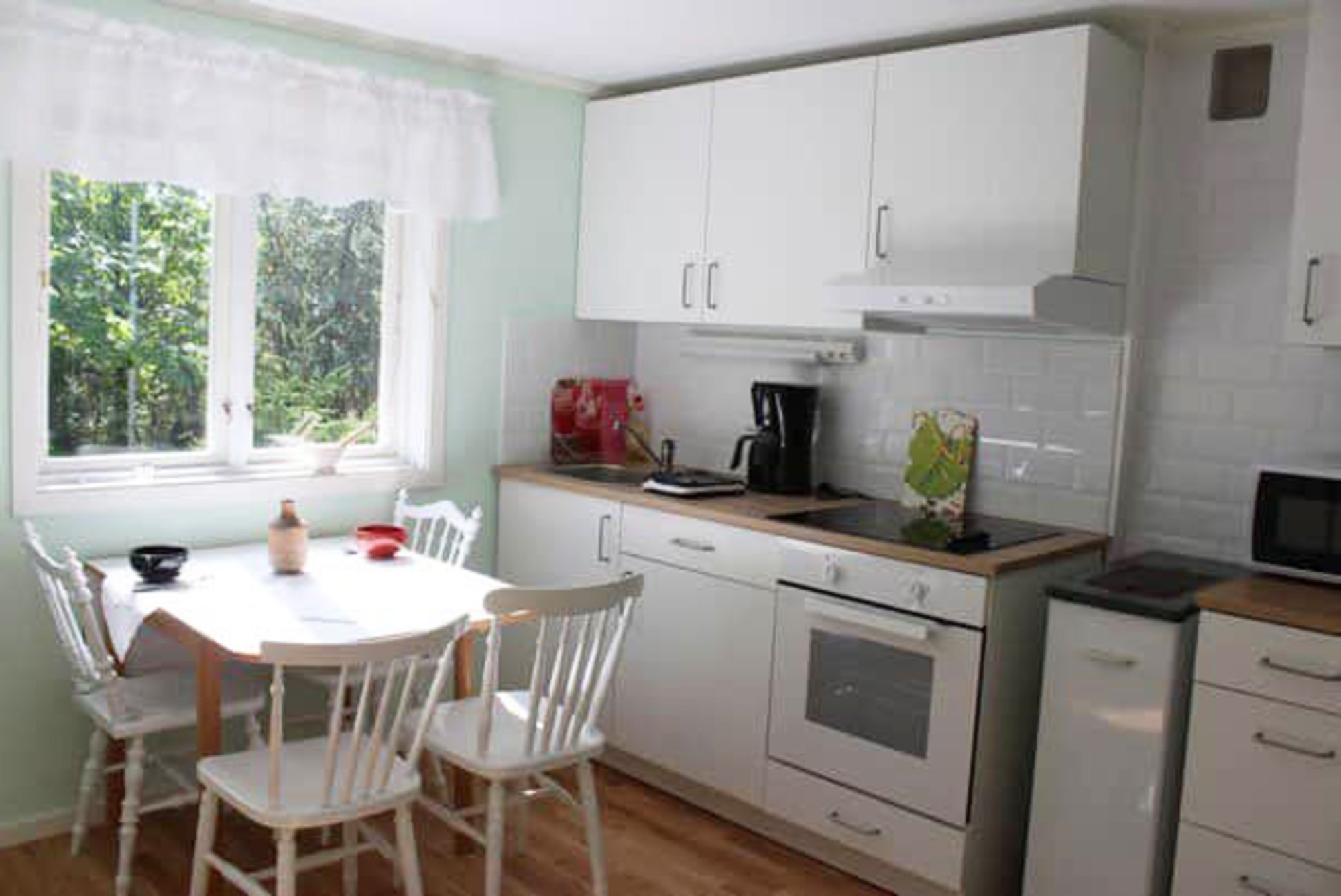 Gäststugan håller samma fina standard med fullt utrustat kök, helkaklat badrum och ett sovrum med 105 cm säng – perfekt för tonåringen eller gästen som vill ha lite egen ro.