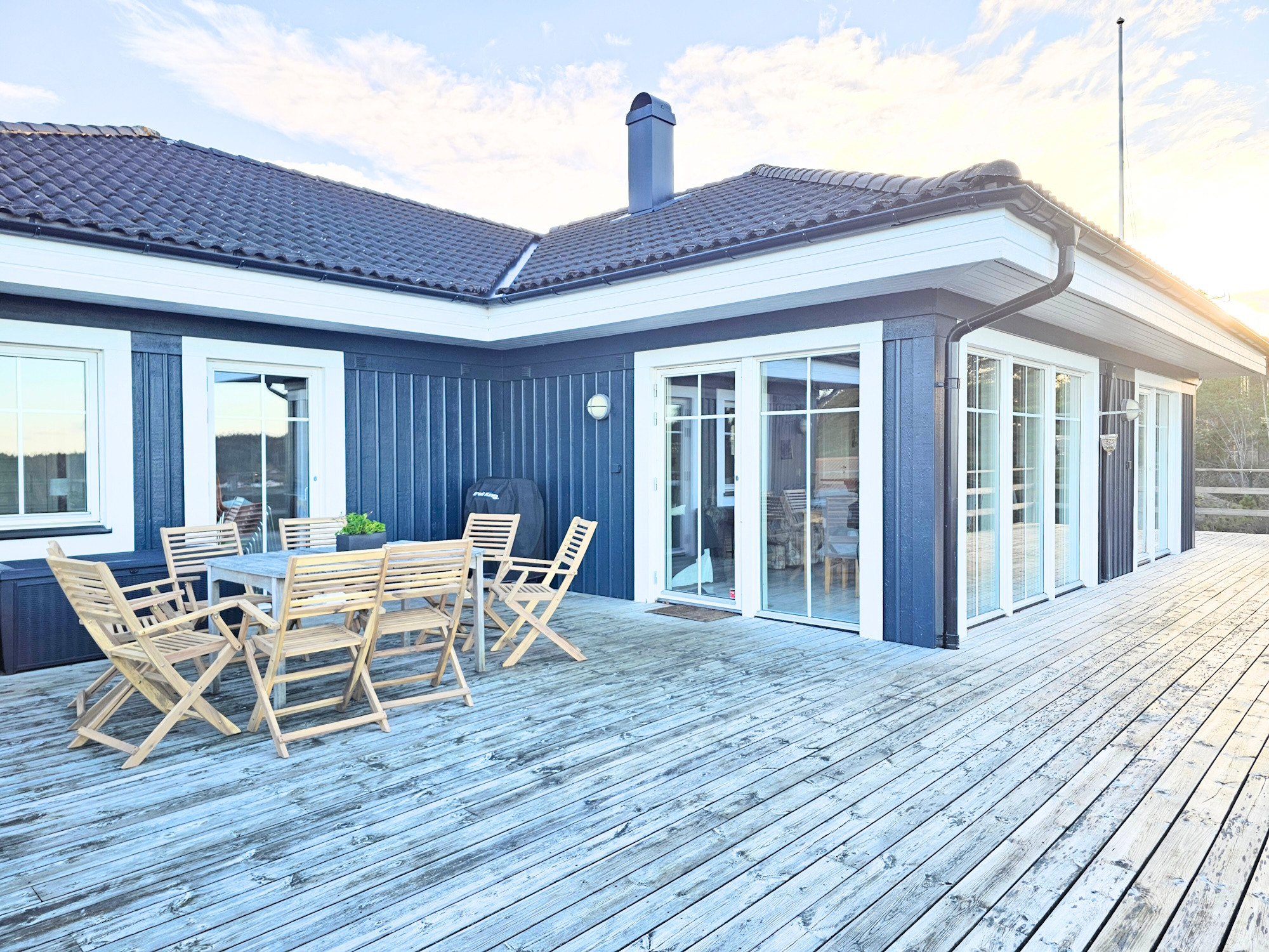 Den stora altanen i söderläge bjuder på sol från morgon till kväll, med både matgrupp, loungehörna och grill för härliga sommarkvällar.