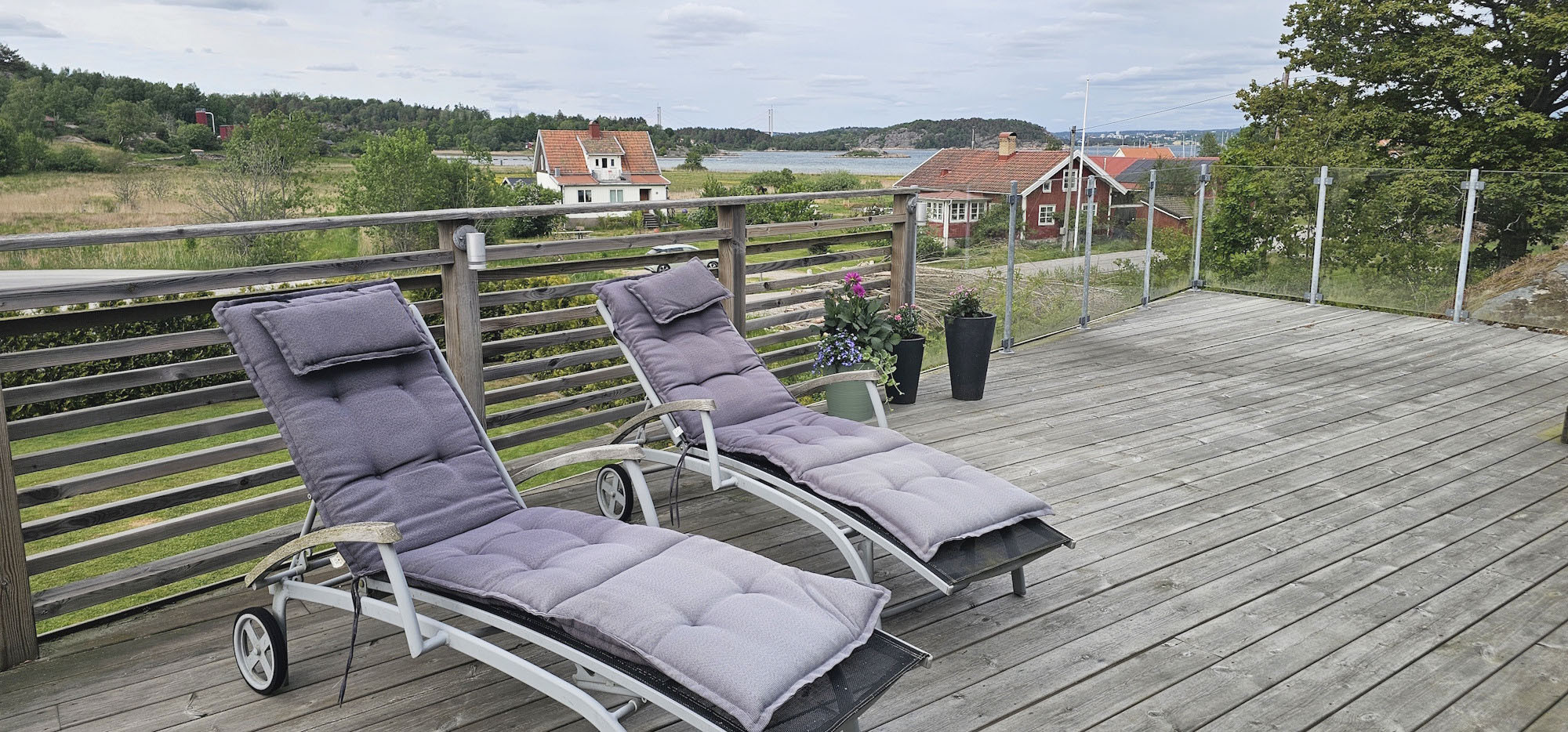 På andra sidan stugan har vi den tilltagna altanen, med ett stort bord och stolar för 6 personer, 4 solstolar och havet precis utanför. Där kan ni sitta länge och njuta av skvalpet från havet och titta på båtarna som åker förbi. Intill stugan ligger gäststugan med en stor dubbelsäng med utsikt över fjorden. Perfekt om man är tex 2 par och vill sova ostört.