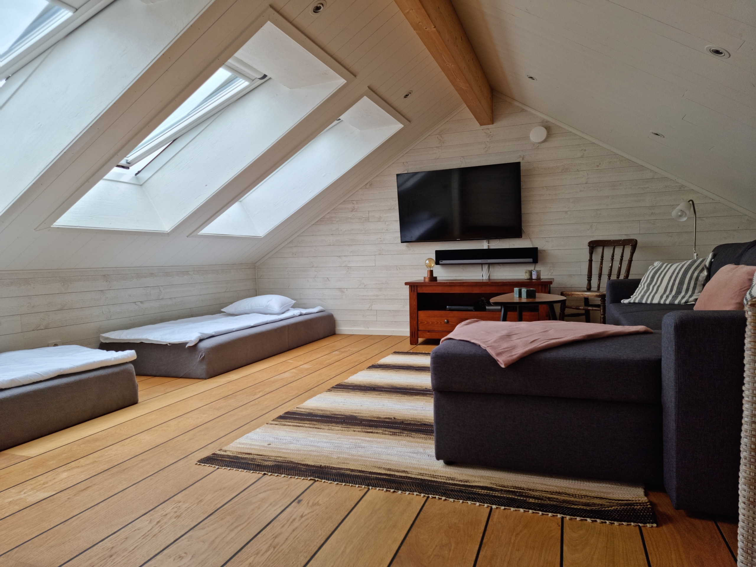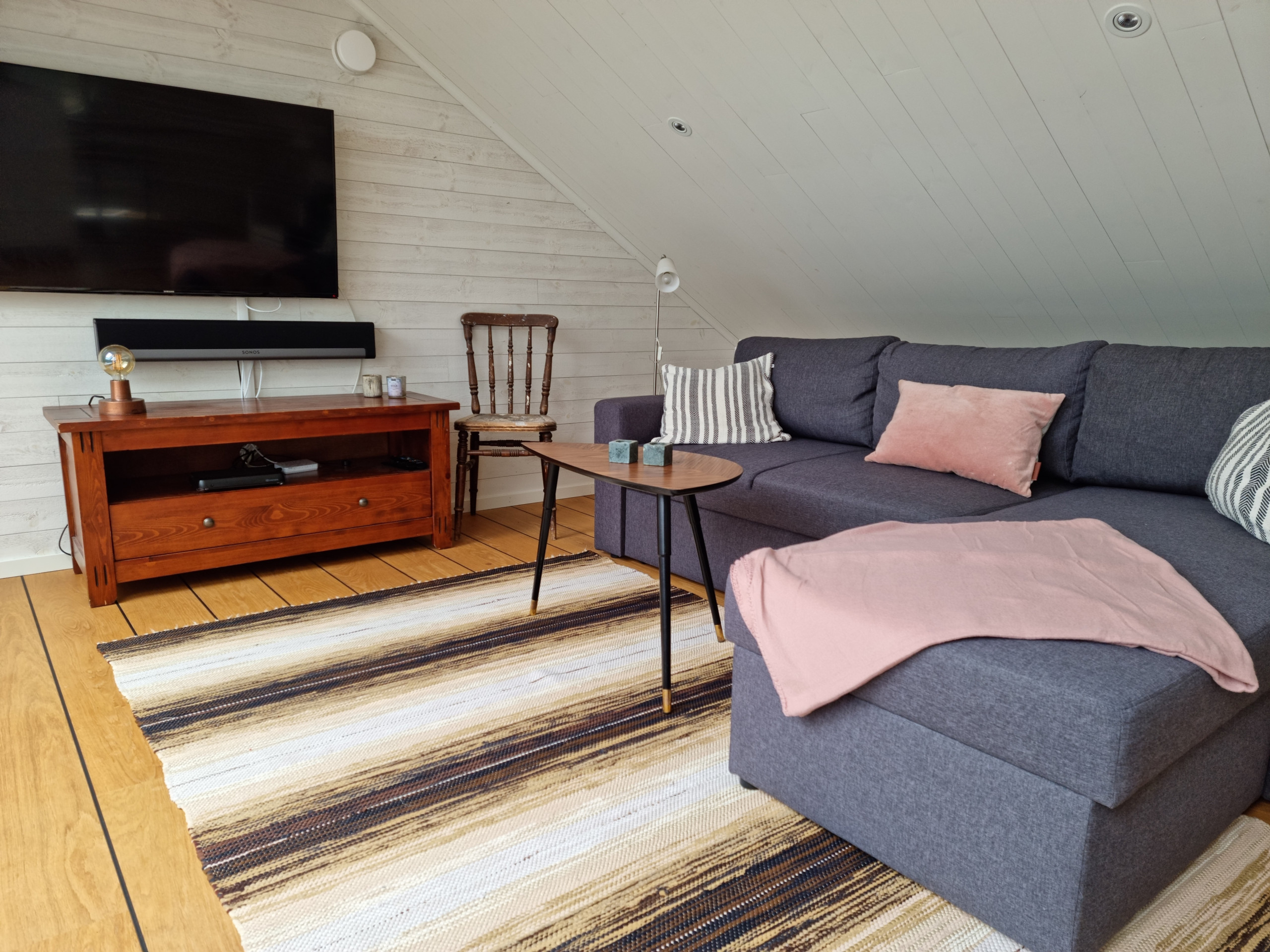 Huset är smakfullt inrett och erbjuder upp till 6 sovplatser (4+2) fördelat på ett sovrum med dubbelsäng och ett loft med två enkelsängar samt bäddsoffa. Det ljusa köket har allt man behöver för en bekväm vistelse, inklusive diskmaskin, mikro, spis, ugn och kyl/frys. På entréplan finns också ett fräscht badrum med dusch och tvättmaskin. Loftet rymmer en soffa, TV med Apple TV och högtalare – en perfekt plats för mysiga kvällar.